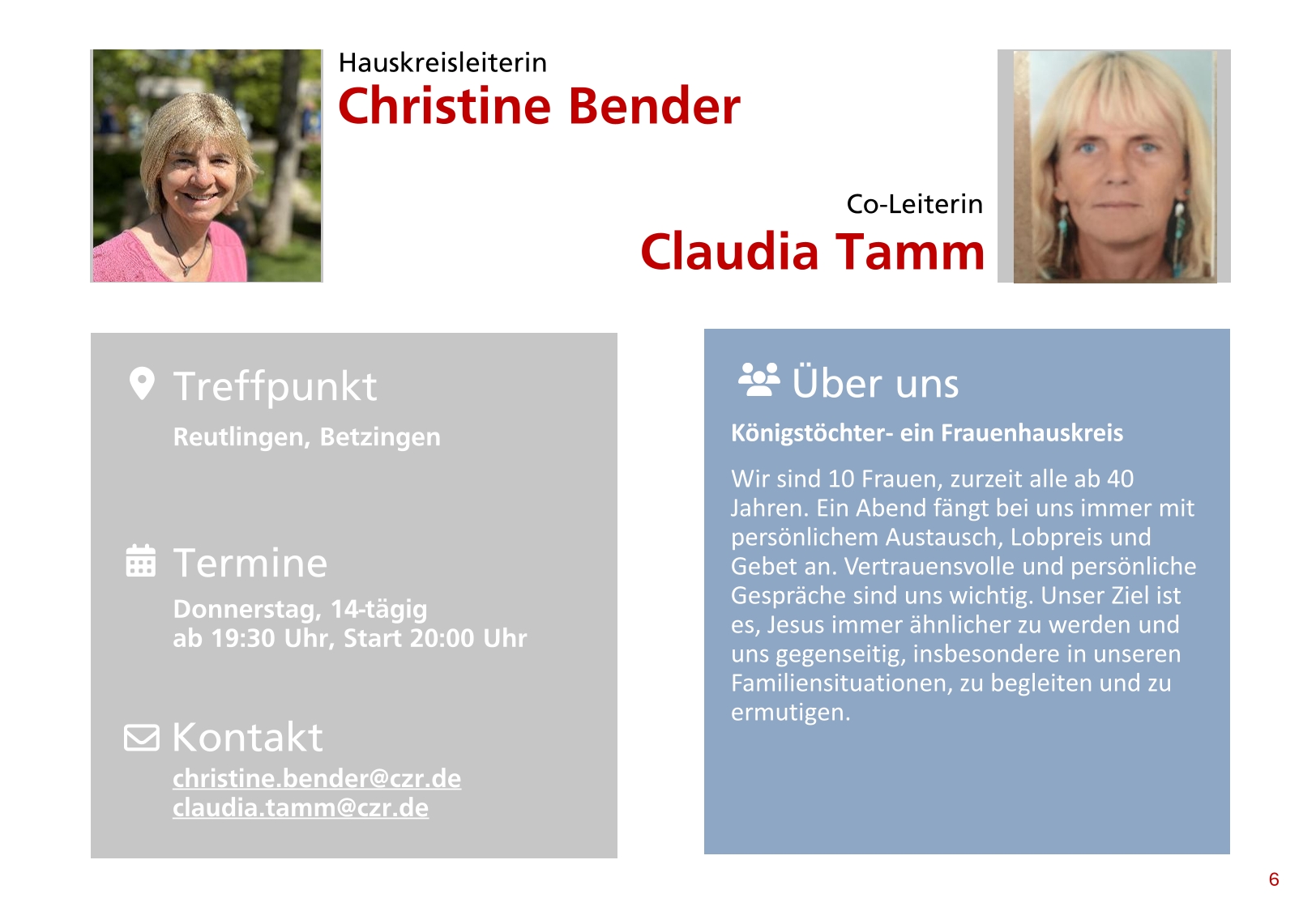 Wir von Ladies Connect sind Frauen aus dem CZR mit dem Herzensanliegen, für uns Frauen in unserer Gemeinde und für Frauen in unserem Umfeld einen Raum zu schaffen, in dem Gemeinschaft, Austausch und Herzensnähe stattfinden kann. Ladies Connect heißen wir deswegen, weil wir miteinander „connecten“, sprich in der Beziehung zueinander und auch gemeinsam in unserer Beziehung mit Gott wachsen möchten.